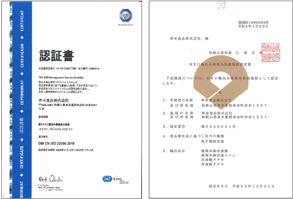 串本食品はISO22000とEU-HACCPの認証取得を受けています。(対米FDA工場登録済)